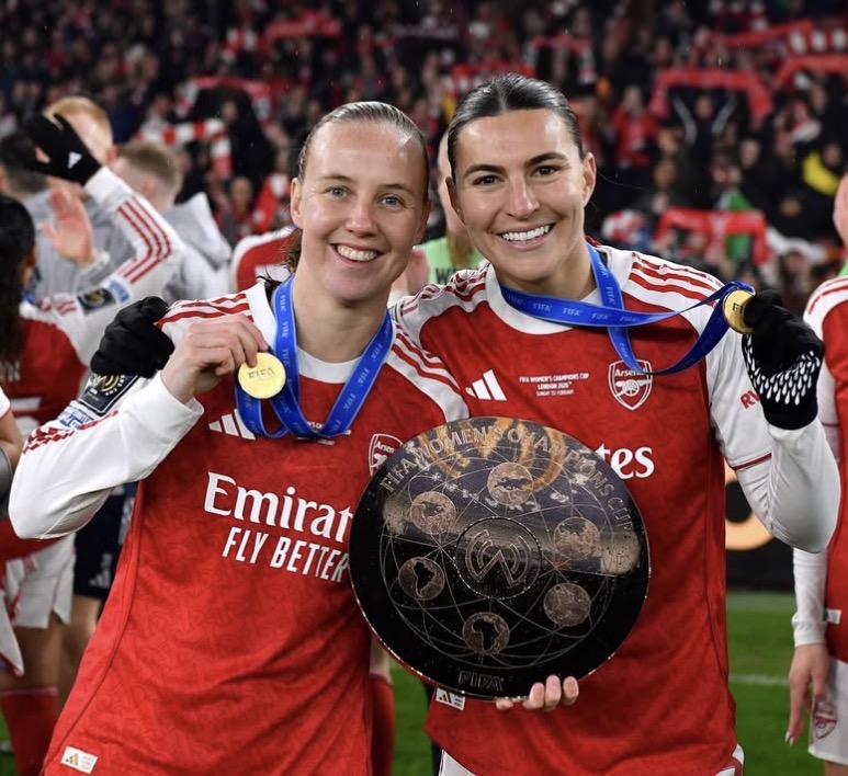 Steph Catley (right) with her close friend and roommate Beth Mead (left), wearing winners' medals and holding up Arsenal's FIFA Champions Cup trophy. Source: Instagram (@stephcatley).