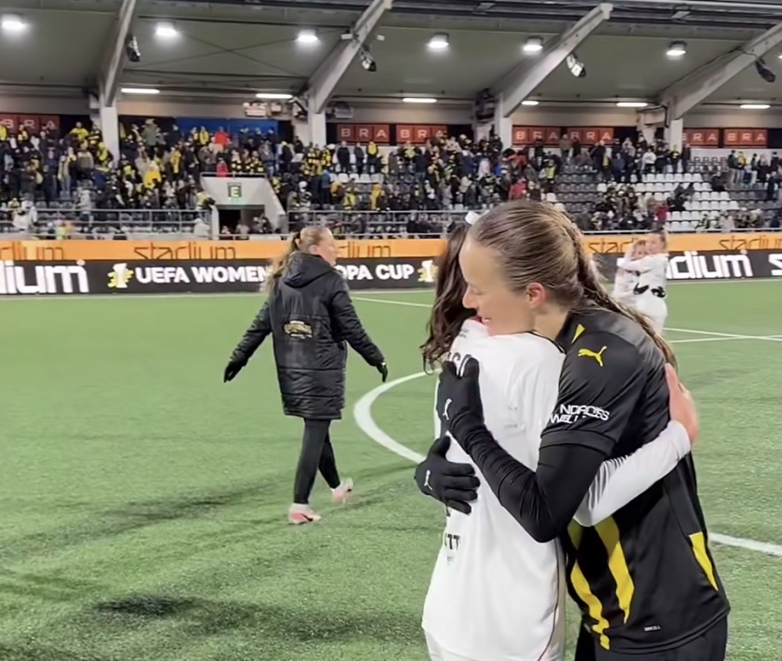 An Aussie embrace: Hayley Raso (left) hugged Aivi Luik (right) after the two faced off in the Europa Cup semi-finals. Häcken beat Frankfurt 3–1 on aggregate, meaning Aivi is in the race for a treble at 41 years old. Image source: Instagram (@weuropacup).